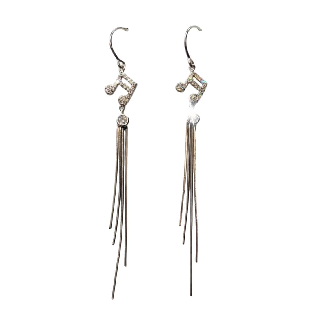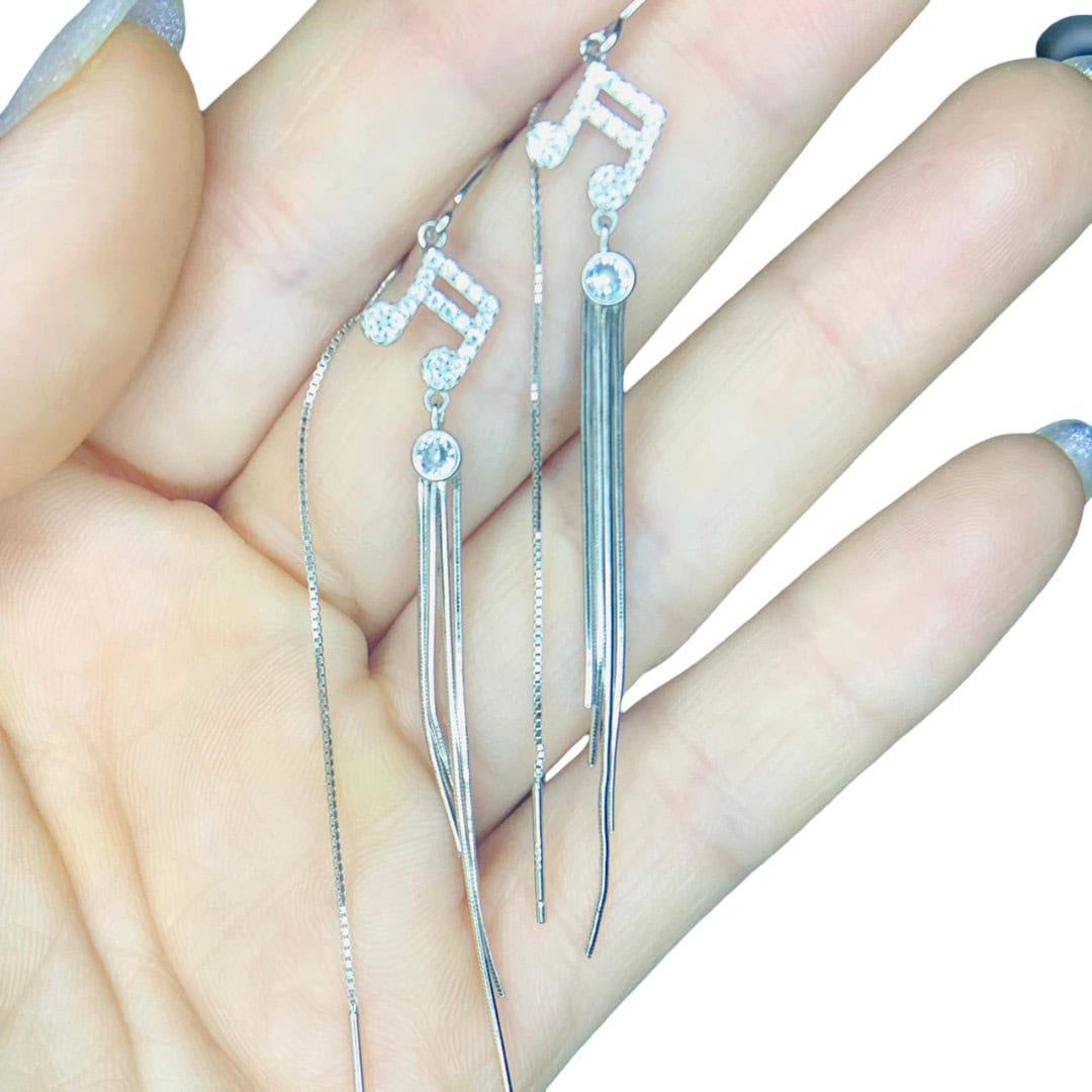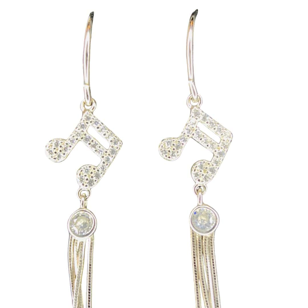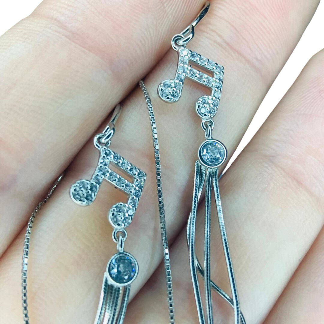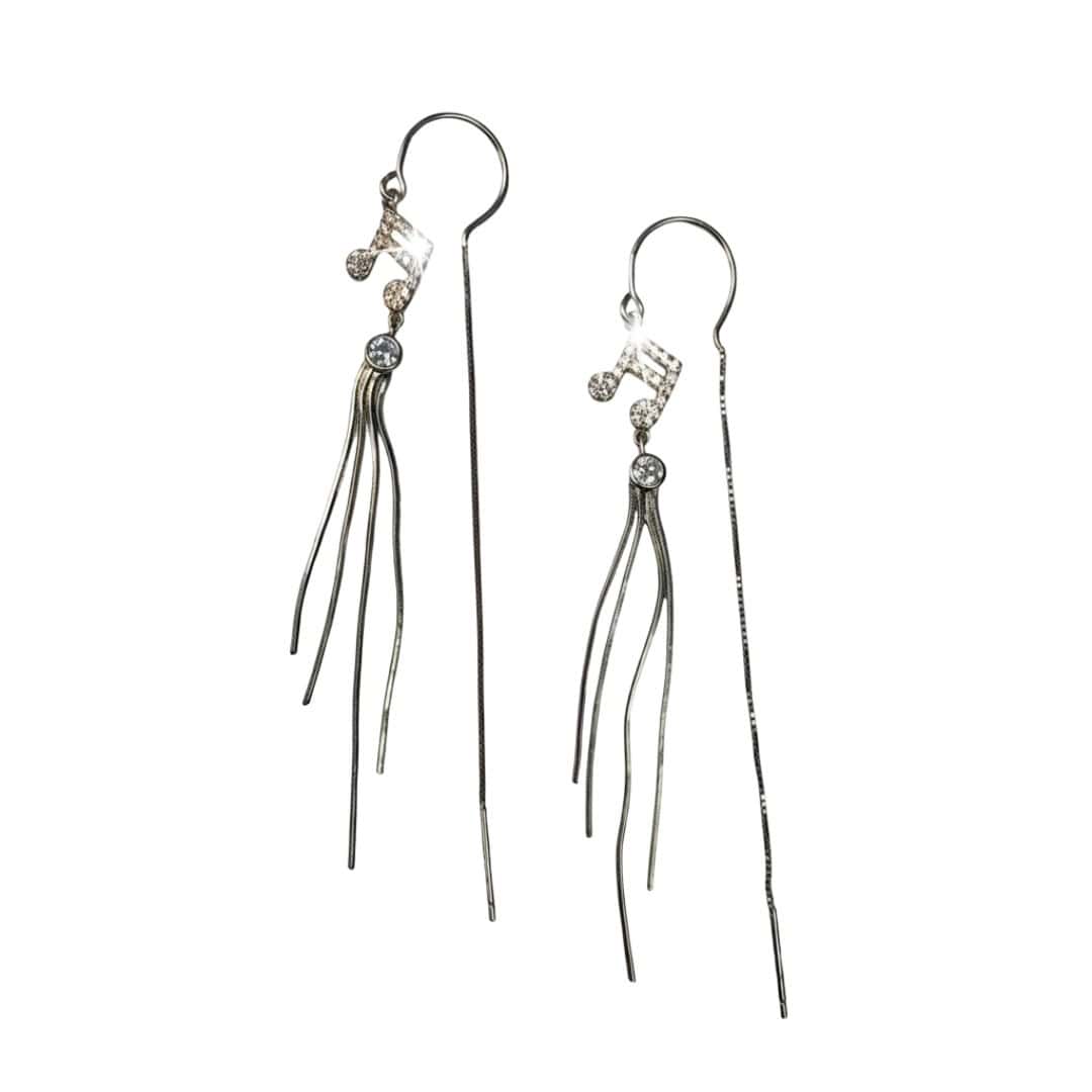 Estos encantadores aros colgantes de hermosas Corcheas elaborados en Plata de Ley 925, presentan un diseño artístico y musical ideal para quienes buscan una joya con personalidad y movimiento. La pieza central destaca por una brillante nota musical meticulosamente engastada con micro-circones que capturan la luz de manera espectacular, seguida de un circón redondo que sirve de unión hacia una elegante cascada de finos hilos de plata. Esta caída fluida aporta una verticalidad sofisticada que estiliza el rostro, convirtiéndolos en el accesorio perfecto para combinar la pasión por el arte con un estilo refinado y moderno.