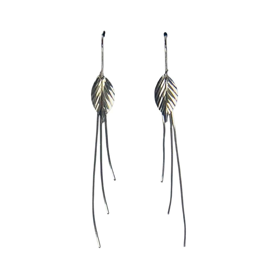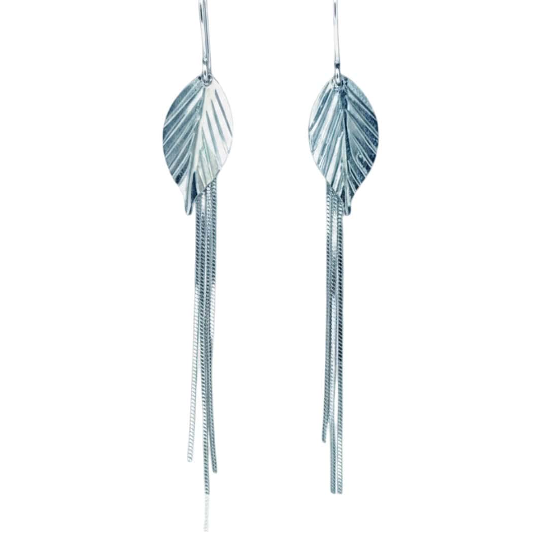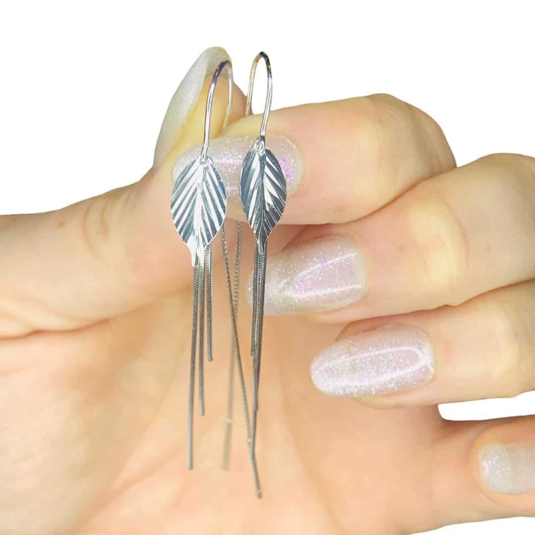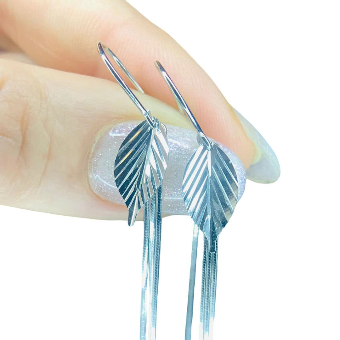 Añade un toque de frescura y movimiento a tu estilo con estos elegantes aros de plata de primera ley, que presentan un diseño de hoja finamente detallada con nervaduras marcadas para un acabado realista. De cada hoja suspenden delicados hilos de cadena tipo “veneciana” o de eslabón fino que caen con suavidad, creando un efecto visual alargado y sofisticado que estiliza el rostro en cada movimiento. Gracias a su diseño ligero y su brillo pulido, son el accesorio ideal para quienes buscan una joya de inspiración natural que combine la sencillez con un toque moderno, siendo perfectos tanto para eventos especiales como para elevar un look casual con distinción.