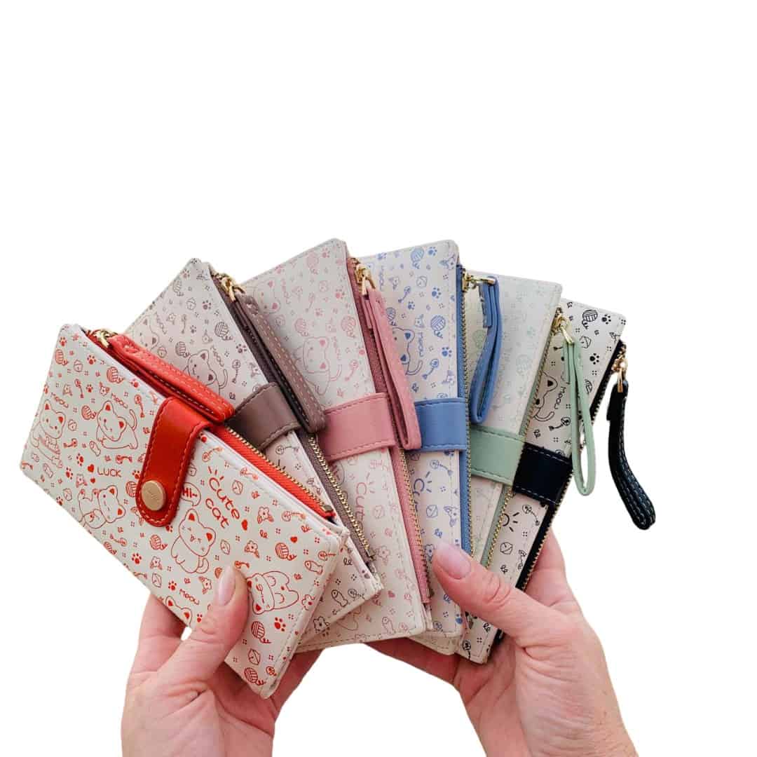 Esta Billetera de Ecocuero con Diseño de Gatitos es el accesorio ideal para las amantes de los animales que buscan combinar ternura y organización en un solo lugar. Su diseño alargado destaca por un encantador patrón de gatitos y ovillos de lana, complementado con una práctica correa de mano y un broche de seguridad en tonos pastel que aseguran tus pertenencias con estilo. Al abrirla, ofrece una excelente capacidad de almacenamiento con múltiples ranuras para tarjetas, un compartimento transparente para identificaciones y un amplio bolsillo con cierre para monedas o billetes. Disponible en una variedad de colores suaves como lavanda, verde menta, rosa y café, esta billetera es tan funcional como adorable, convirtiéndose en el detalle perfecto para tu día a día en Tammy’s.