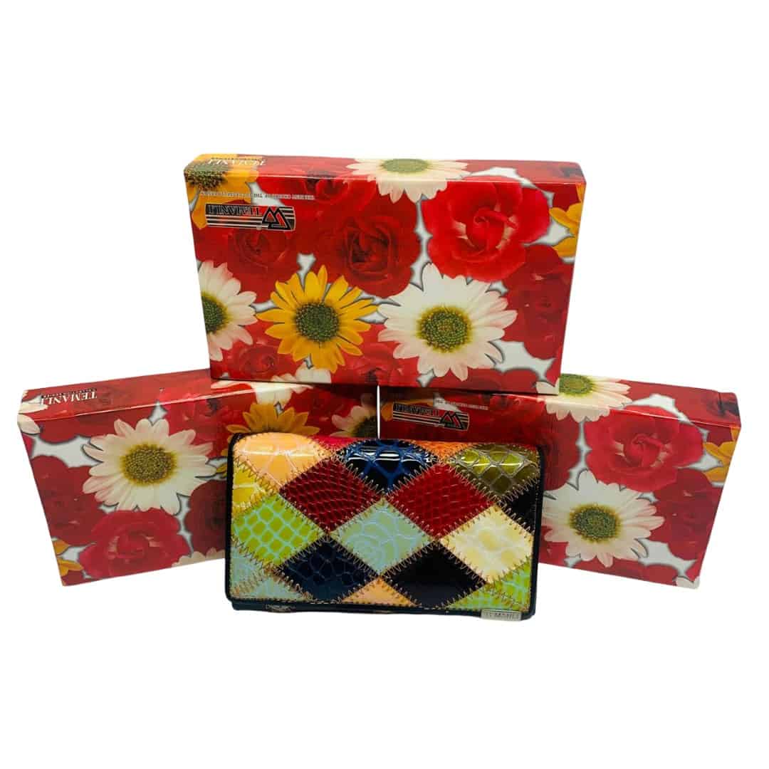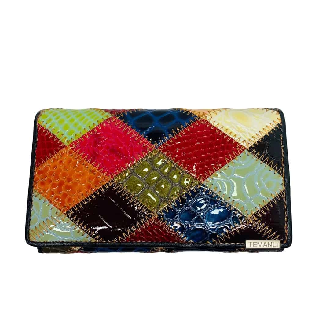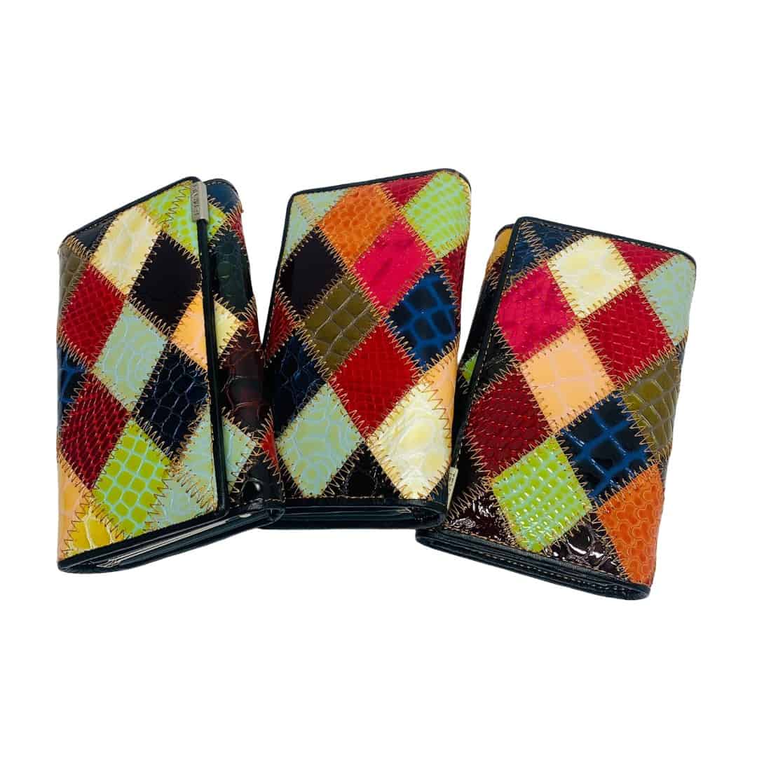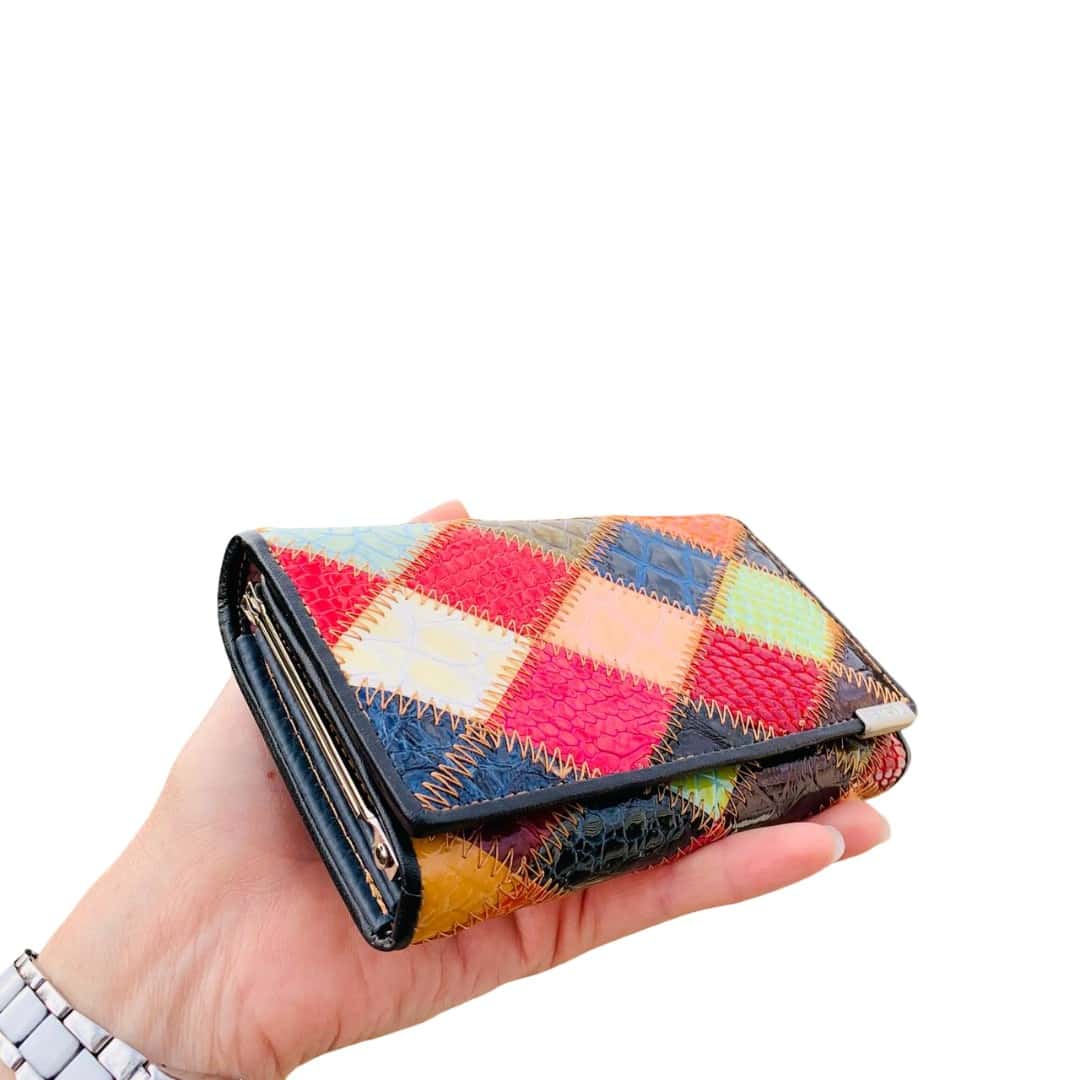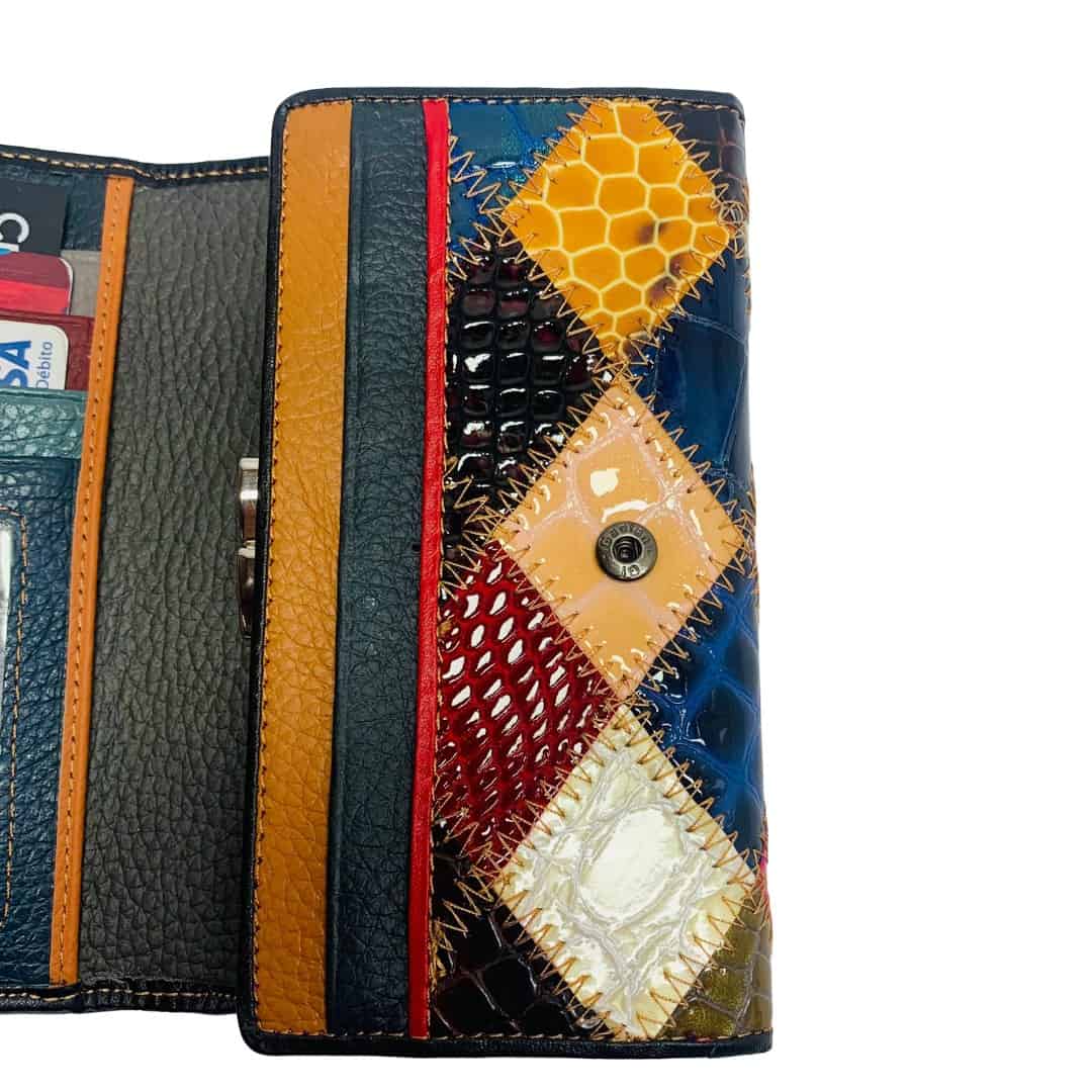Esta billetera de cuero con diseño patchwork destaca por su estilo vibrante y artesanal, combinando retazos en una variada paleta de colores y texturas con elegantes acabados en relieve. Su estructura funcional incluye un amplio compartimento con cierre de marco metálico para billetes, múltiples ranuras para tarjetas y una ventana de identificación, ofreciendo una organización excepcional sin perder su esencia bohemia y original. Es el accesorio ideal para quienes buscan una pieza única que equilibre perfectamente la practicidad con un diseño lleno de personalidad.