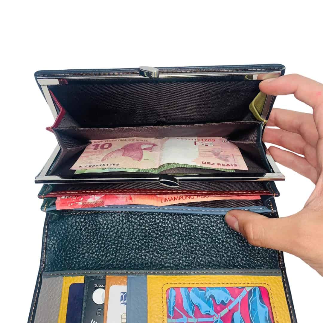Esta billetera de cuero con diseño patchwork destaca por su estilo vibrante y artesanal, combinando retazos en una variada paleta de colores y texturas con elegantes acabados en relieve. Su estructura funcional incluye un amplio compartimento con cierre de marco metálico para billetes, múltiples ranuras para tarjetas y una ventana de identificación, ofreciendo una organización excepcional sin perder su esencia bohemia y original. Es el accesorio ideal para quienes buscan una pieza única que equilibre perfectamente la practicidad con un diseño lleno de personalidad.
