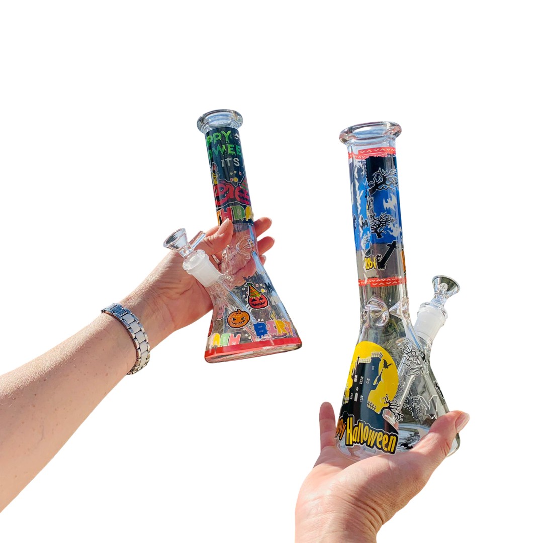 Este Bong de Vidrio Estilo Beaker presenta un diseño temático de Halloween, ideal para quienes buscan una pieza con personalidad y un toque divertido. Su estructura clásica de base ancha asegura una excelente estabilidad, mientras que el cuerpo de vidrio traslúcido está decorado con ilustraciones detalladas de murciélagos, calabazas y escenas nocturnas que envuelven tanto el cuello como la base. Es una opción perfecta para coleccionistas que valoran la combinación de un formato funcional y duradero con una estética festiva y llamativa.