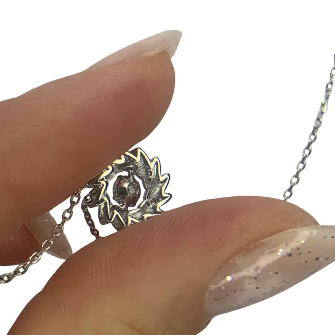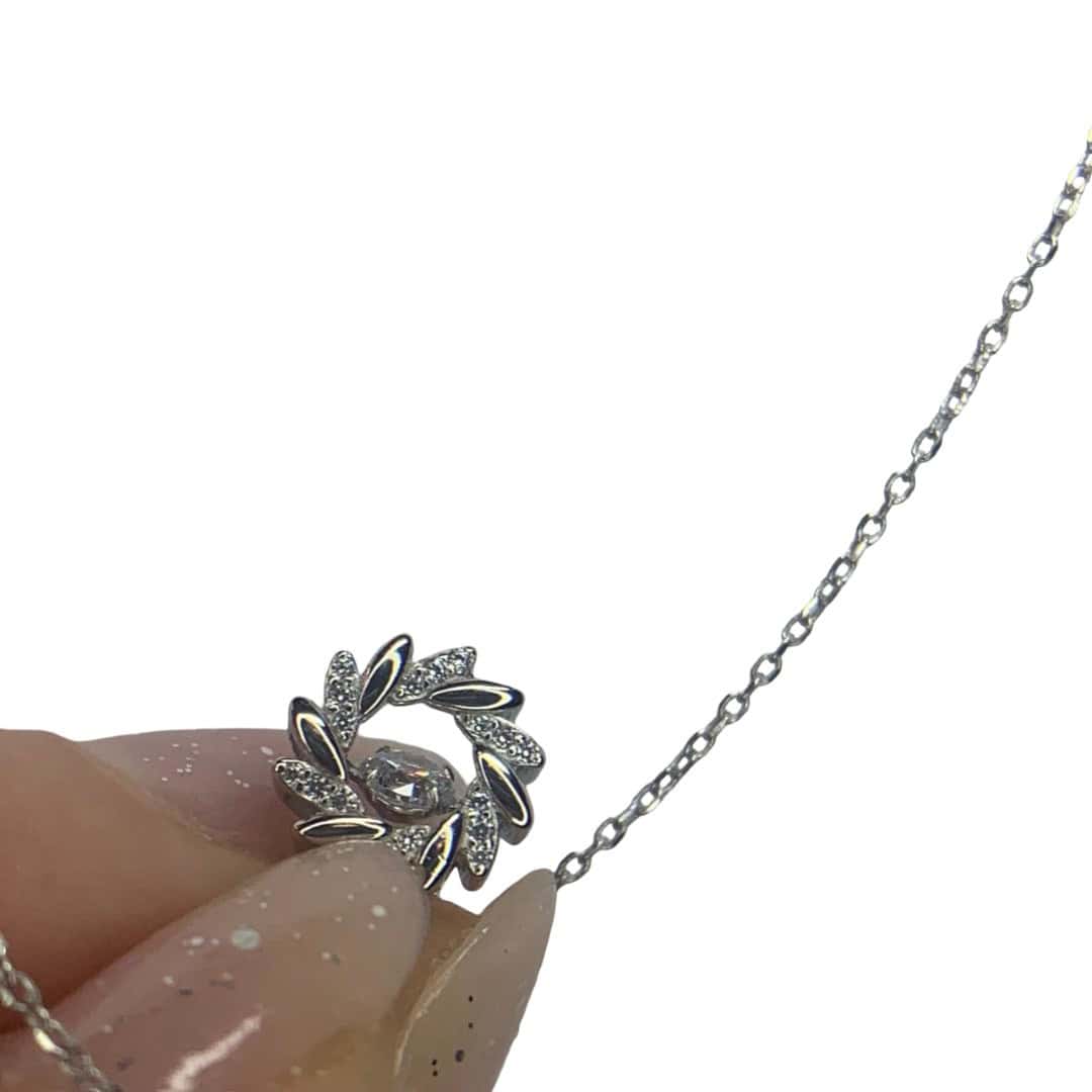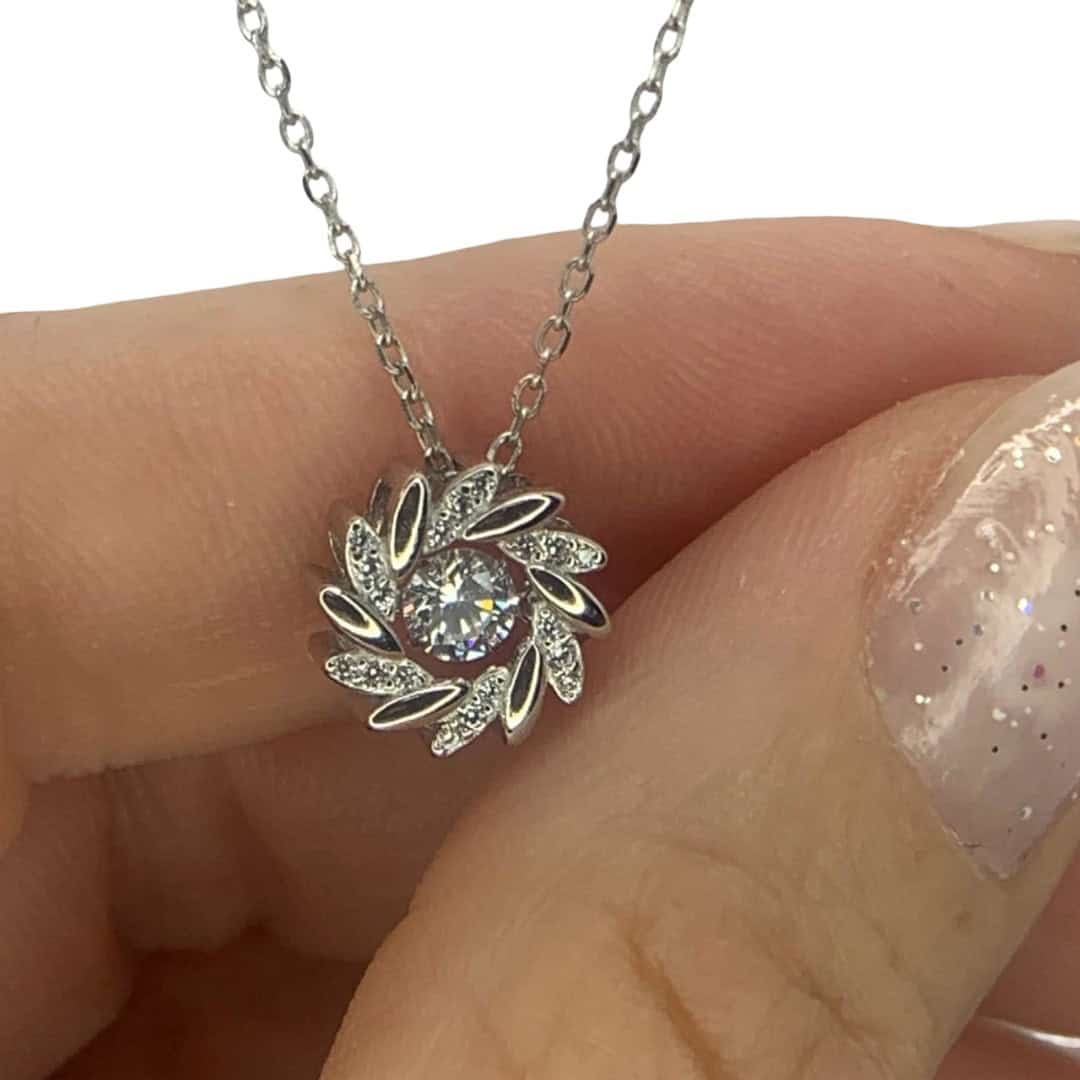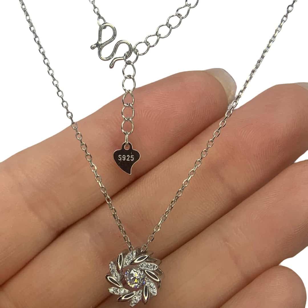 Este deslumbrante collar de plata 925 presenta un diseño artístico de corona circular, cuyos pétalos intercalan un acabado liso pulido con el brillo de delicados circones incrustados. El elemento central de la pieza es una imponente piedra flotante que, gracias a su sistema de movimiento, oscila libremente para capturar la luz desde cualquier ángulo y crear un destello constante y sofisticado. Es una joya de elegancia atemporal y diseño interactivo, ideal para quienes buscan un accesorio que combine la finura de los metales preciosos con un toque de magia y movimiento moderno.