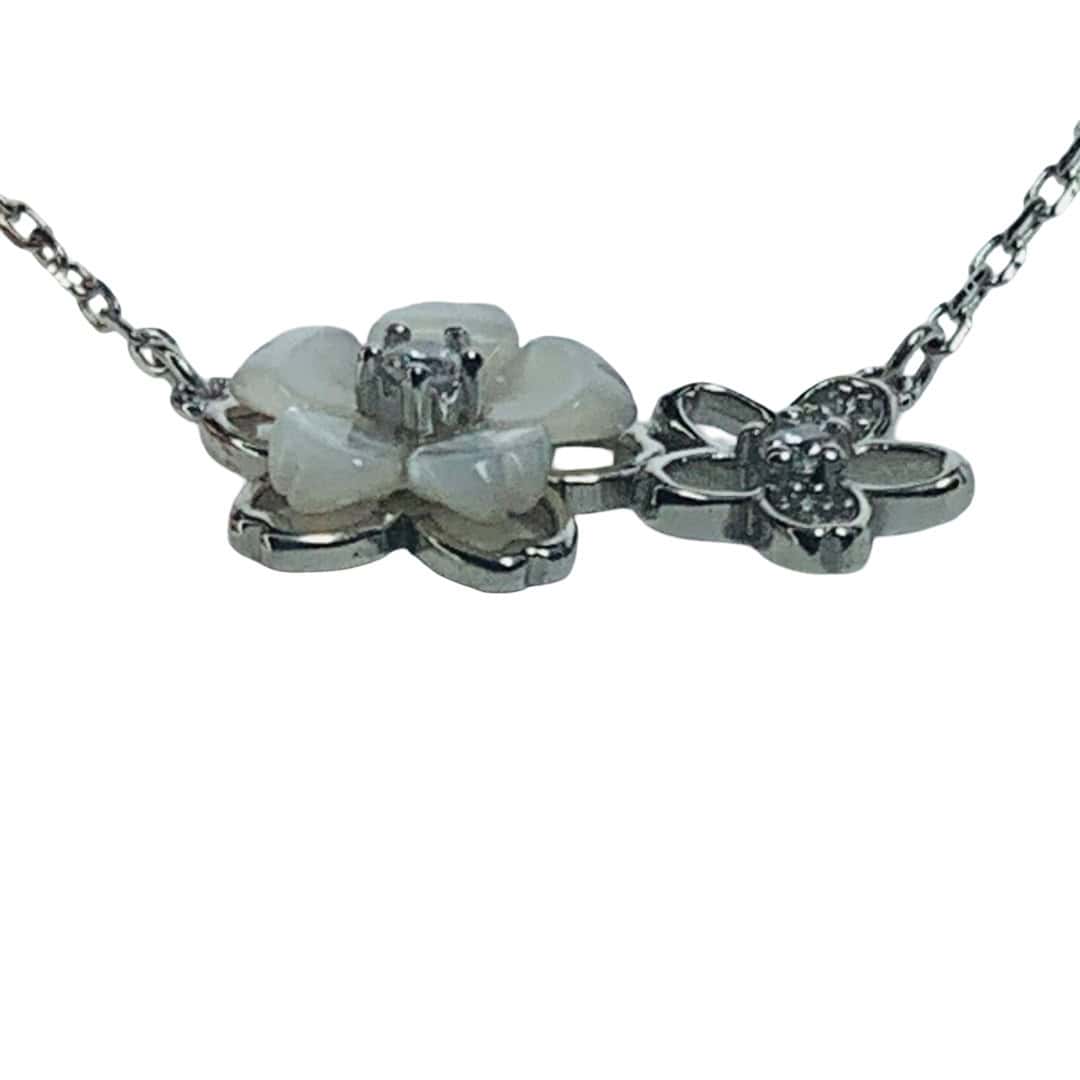 Este delicado collar de plata 925 presenta un diseño doble de inspiración floral que combina texturas y brillos de forma excepcional. La pieza central es una flor principal con pétalos de nácar (madreperla) que aportan un lustre iridiscente y natural, acompañada a su lado por una flor más pequeña de silueta calada y adornada con circones brillantes. Esta armoniosa composición, unida a una fina cadena de eslabones, crea un accesorio femenino y sofisticado, ideal para quienes buscan una joya que capture la delicadeza de la primavera con un acabado elegante y atemporal.