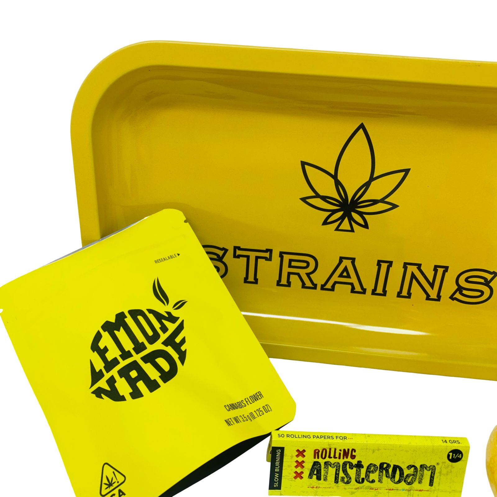 Este vibrante Yellow Pack de Parafernalia está diseñado para destacar, combinando una estética energética con todo lo necesario para una experiencia completa. El kit incluye un bong de vidrio en un llamativo tono amarillo moteado, una bandeja metálica de gran tamaño con diseño “Strains” y un moledor metálico de alta resistencia con detalles grabados. Para complementar el conjunto, el pack incorpora una pipa de vidrio con detalles en espiral, encendedor, papeles de enrolar de “Rolling Amsterdam” y un práctico empaque hermético de “Lemonnade”, asegurando que cada accesorio mantenga la cohesión visual y funcional que caracteriza a las colecciones de Tammy’s.